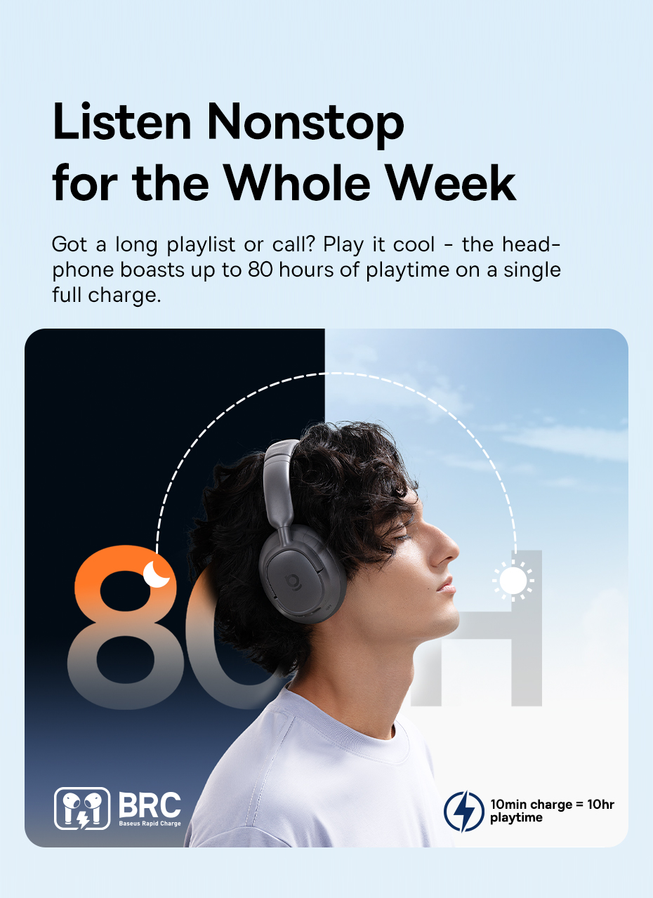Một trong những điểm nổi bật của Baseus Bass BH1 chính là thời lượng pin cực kỳ ấn tượng. Chỉ với một lần sạc, tai nghe có thể phát nhạc liên tục tới 60 giờ (khi sử dụng kèm hộp sạc). Dù bạn mang đi làm, đi học hay du lịch dài ngày, BH1 luôn đồng hành bền bỉ cùng bạn.